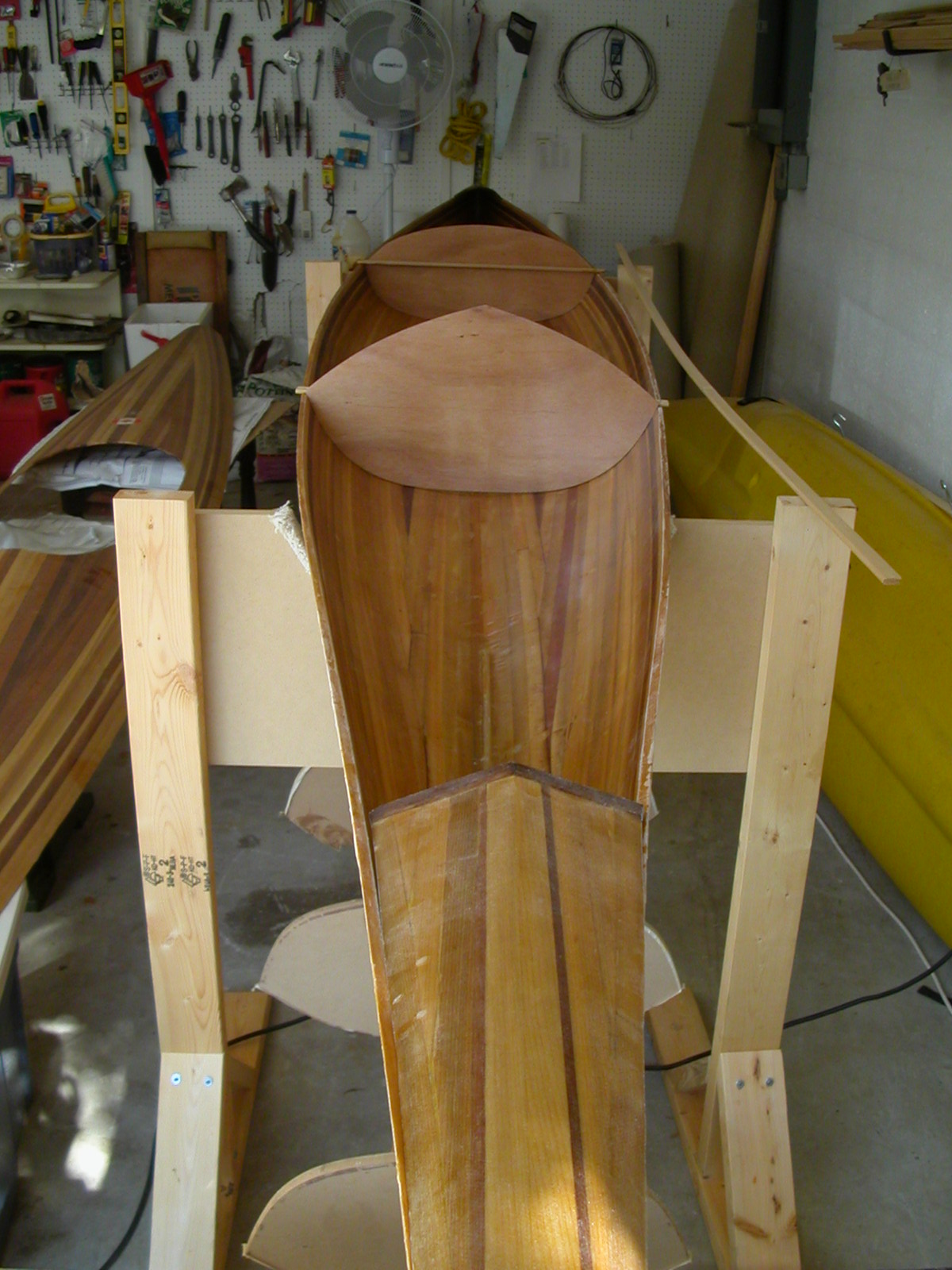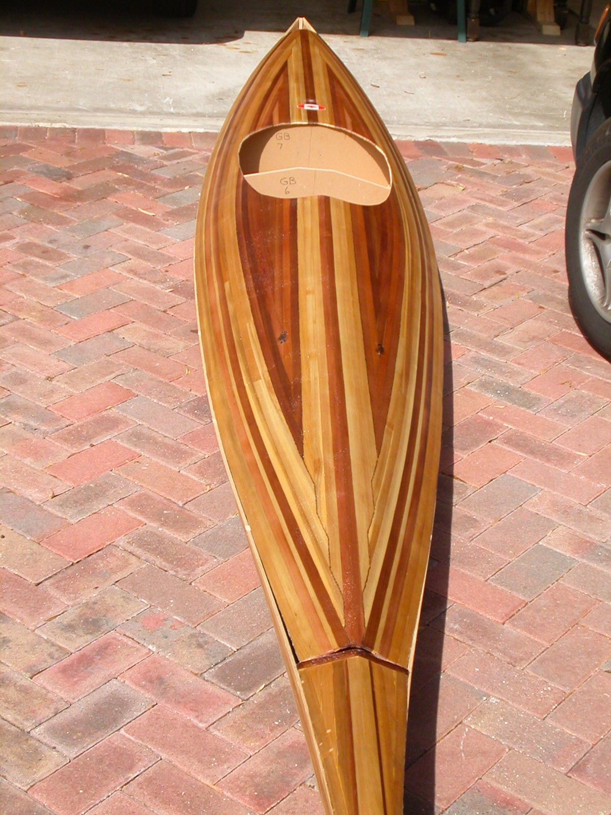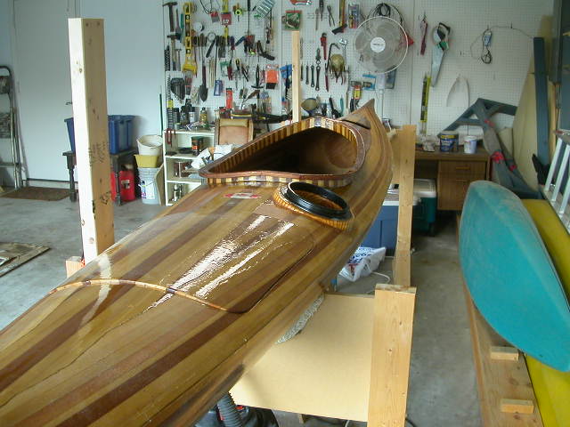 A cosmetic 'mistake' I made was that during the stripping of the deck, I stripped the deck plates separately, right from the beginning, which was the recommended approach in my plans. But, I'd now recommend the alternative of stripping and glassing the entire deck (as though you were NOT even thinking of having separate deck plates). Then, just before it's time to attach the deck, cut off the front two feet of the bow-deck and the back one foot of the stern deck and create the plates at that time. Take a look again at photo showing my deck plates, and my idea should be clearer. The patterning of lighter/darker strips of wood won't look as amateur-ish as mine do, but instead will automatically carry right through from the deck to the end-plates. (As an alternative, you can use a radically different pattern on the end-plates by a veneer covering over the end-plates, which I have seen on some designs. Some end-plate designs appear to have been created by fiberglassing a compatibly-colored piece of wall-paper over the underlying strips or whatever to achieve a very different but pleasing contrasting pattern.)