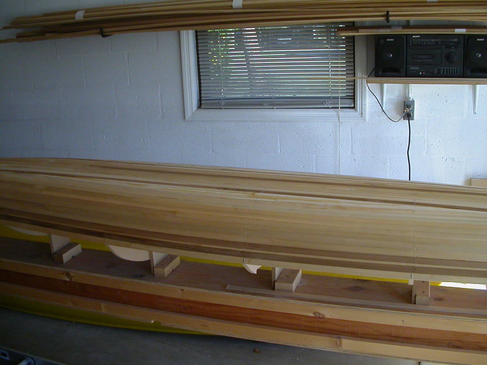 I then removed it from the stongback (i.e. the long wooden support box that holds the station forms) and placed it upright, so that I could begin the strips for the top-deck. This phase started in about January of 2004. Here is a photo showing it resting on the two upright supports, just before I cut the wells in those supports to properly support the hull for this next phase. Notice that you can see each of the station forms protruding up inside the hull. They were needed to fasten the strips to during the stripping of the hull, and they will be needed again to fasten the deck strips to. They give the hull and deck their needed shapes. This photo is taken from the stern (back) of the kayak...notice the extra elevation of the forms starting in the middle going forward, which is the area where there needs to be extra room for the paddler's knees.