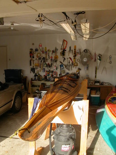 My homebuilt sea-kayak project began when I first lived in New Hampshire. I attended an 80-hour workshop class at Newfound Woodworks, in Bristol N.H. in 1999 or 2000. I was the second-person of a two-person team, building an open boat...a design called the Rangeley Boat, which was to be owned by my classmate for his use. Here is Newfound's webpage describing that design. This webpage is from Newfound Woodworks and you can find info there on their various kits, etc. Note that they no longer teach such extensive complete boat-building classes. Instead, they now offer many shorter workshops (approx 5 hours each) on the various phases of wooden canoe and kayak construction. Also note that they host a one-day 'Rendezvous' once each year in early September in northern New Hampshire, where previous builders and designers and fabricators congregate. Many prospective builders first attend this event, to help them decide whether to tackle such a homebuilt project. They also sell a video (tape or DVD) covering the fiberglassing and epoxying phases, which I highly recommend. I've watched my tape numerous times...typically, I re-watched each section again just prior to the day when I began each of the major fiberglassing/epoxying sessions.